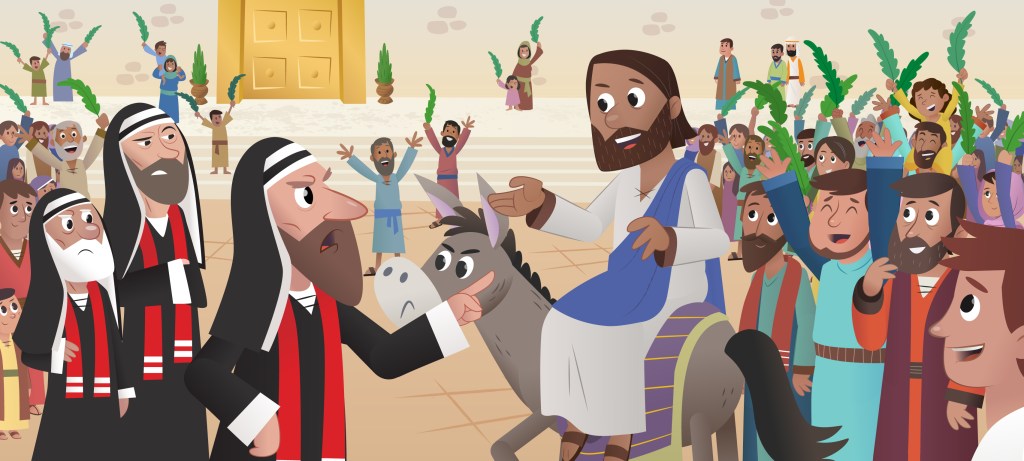 In the Bible reading we will look at in a moment, we will read about how the people greeted Jesus as he entered Jerusalem riding on a donkey on Palm Sunday by shouting out to him and laying palm leaves on the ground in front of him. Some churches remember this day by giving everyone palm leaves to wave as they shout “Hosanna!” Some churches even have a donkey at the church for everyone to look at and for the children to ride!