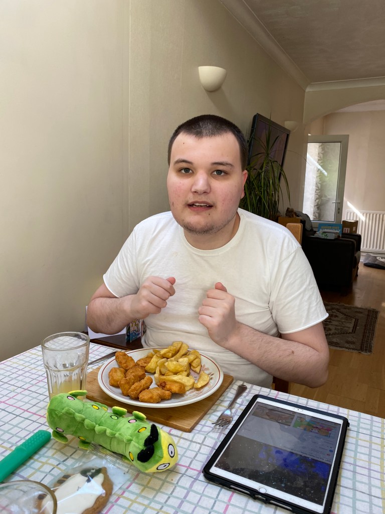 A trip out to James’ favourite places usually ends with a visit to the fish and chip shop on the way home. James has several ‘favourites’ to choose from, sometimes it’s fish cakes, but on this day it was chip shop chicken nuggets and chips.