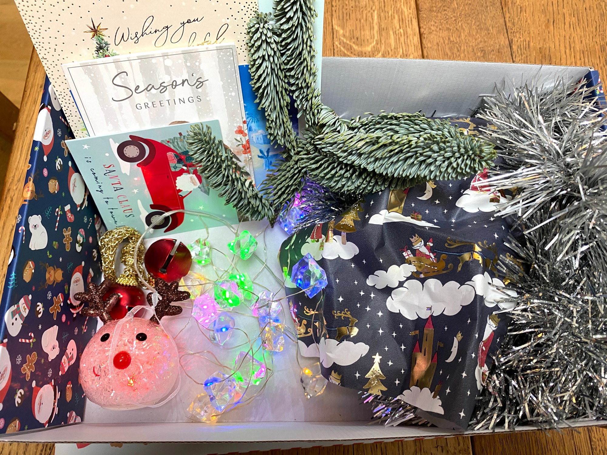 All you need then is a box to put it all in! Maybe you’ve got a delivery box still at home that you could use, or maybe like us you’ve got a Christmas Eve box that can be re-used for your fidget box. If someone had slippers for Christmas (lucky them!) maybe there’s a shoe box that can be re-used.