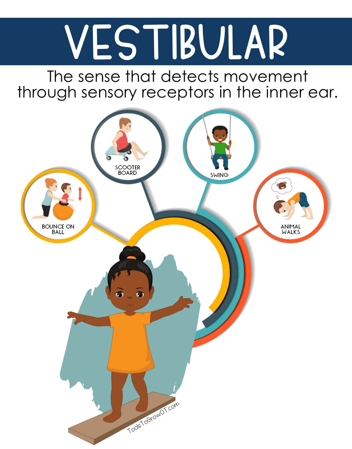 Some people can have under responsive (hyposensitive), or overly responsive (hypersensitive), vestibular systems which can mean, for example, that they either need to move constantly to get the sensory input that they need or can be fearful of movement as they feel unbalanced and might fall.