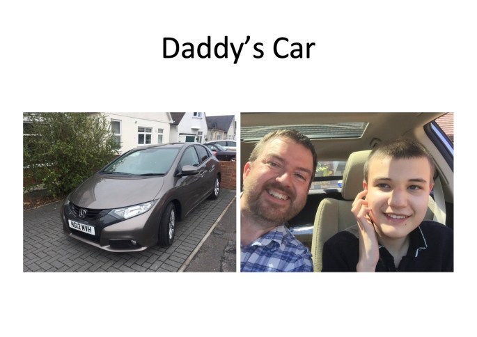 We have to think of things that are able to be done in the car, as although we can support James to come out of the house and get into the car, he is unable to get out anywhere else until we return home. After the house, the car is James’ next best ‘safe place’. All sorts of things take place in the car as a result of this, even including dentist appointments, but we do what is necessary to help James engage in ways that work for him.