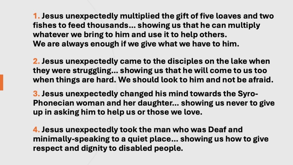 1. Jesus unexpectedly multiplied the gift of five loaves and two fishes to feed thousands… showing us that he can multiply whatever we bring to him and use it to help others… we are always enough if we give what we have to him.